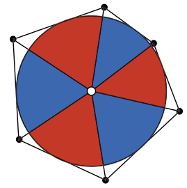 Центр круга соединили отрезками с вершинами шестиугольника, разбив круг на 6 секторов. Эти секторы поочерёдно закрасили в красный и синий цвета. Докажите, что суммарная площадь красных секторов равна суммарной площади синих.